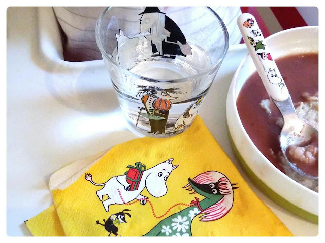 Muumeja pienen aamupalapöydässä. Ostin jo ennen pienen syntymää kivoja muumilaseja.
